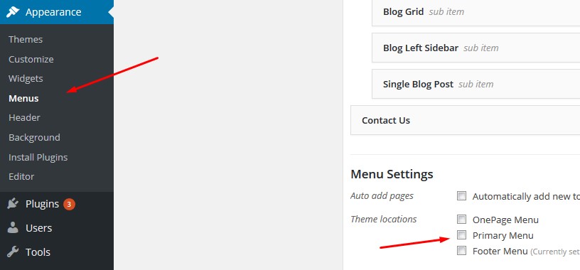 Note: If for some reason, menus does not get assigned automatically, please go to wp-admin/Appearance->Menus to assign menu. (refer image 4 below)