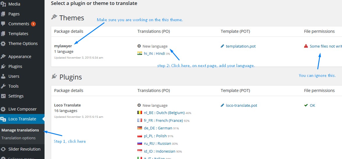 3) Once plugin is activated, you will find a new menu on left. Please go to Loco Translate -> Manage translations, and click on New language link of justshop theme. (Please disregard theme name in following screenshot, it was built for another theme. You can still follow the same steps.)